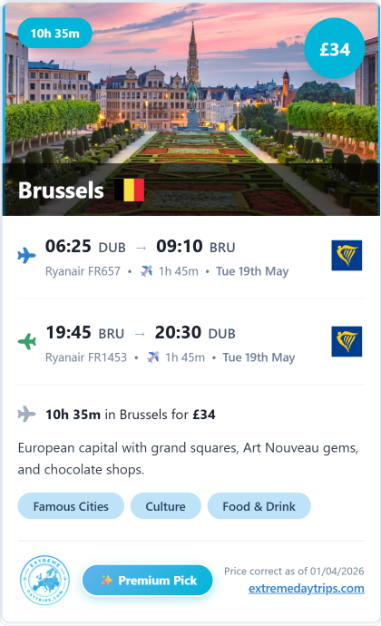 ![]() Brussels (BRU) European capital with grand squares, Art Nouveau gems, and chocolate shops. | £30 | 1h 40m | 189 | £76 |